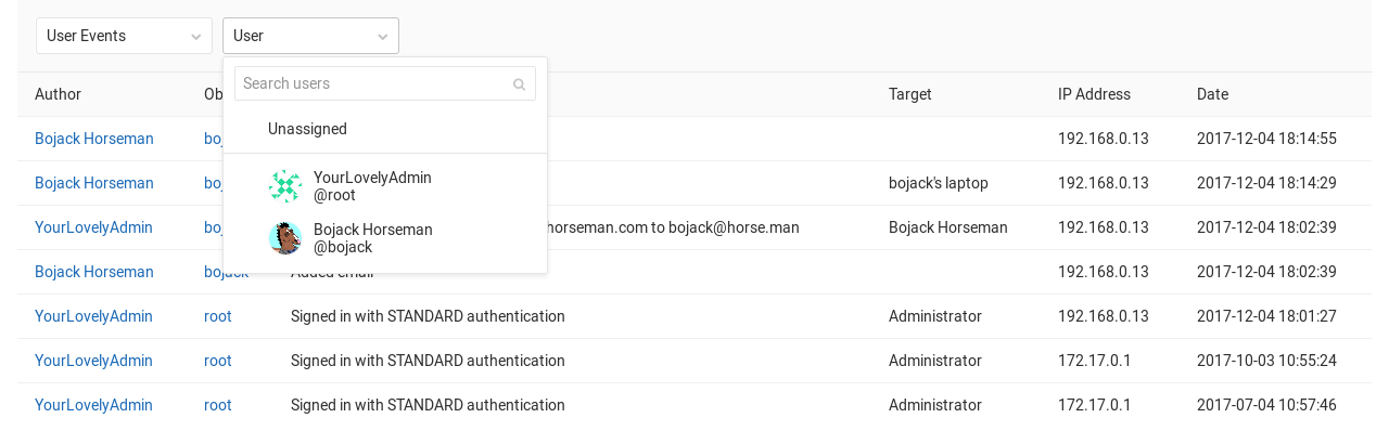 - Events scoped to the group or project, used by group and project managers to look up who made a change.