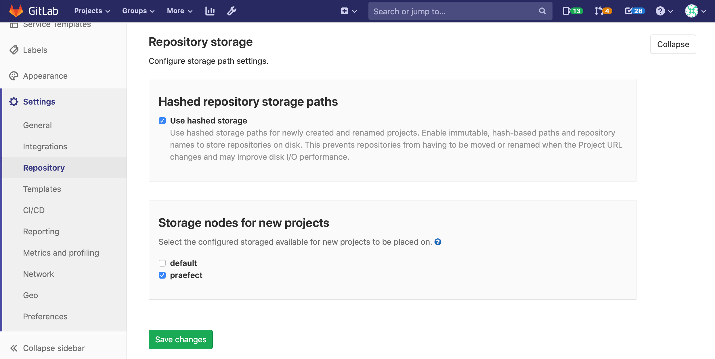 Update the Repository storage settings from Admin Area > Settings > Repository > Repository storage to make the newly configured Praefect cluster the storage location for new Git repositories.