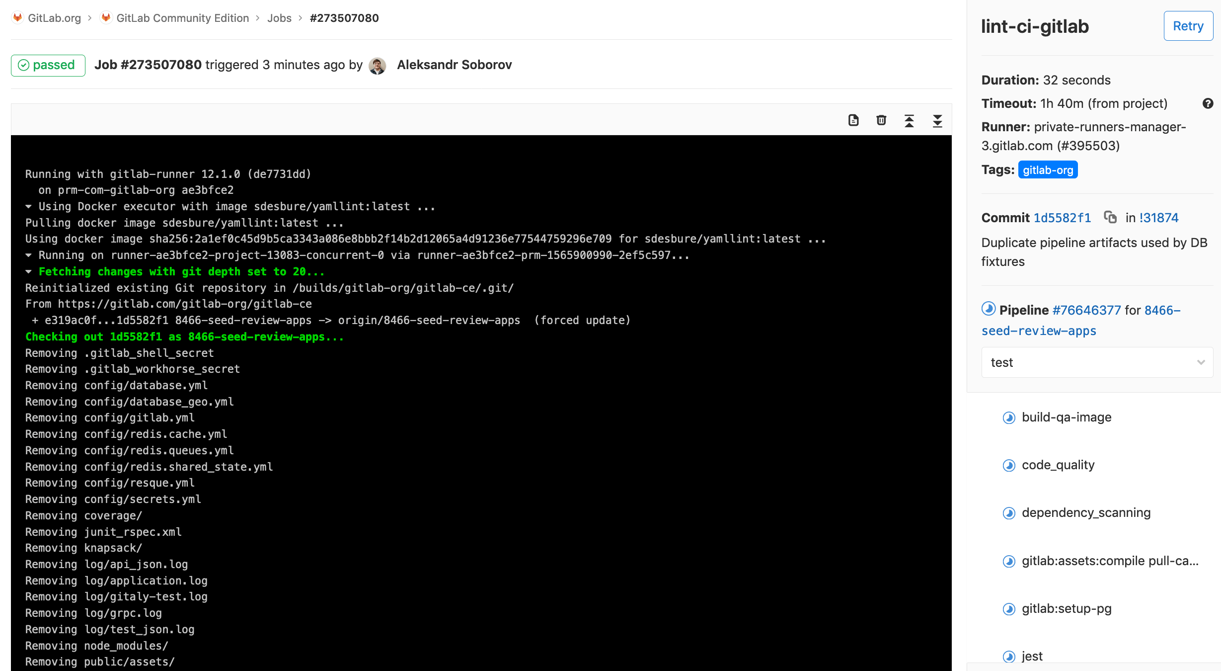 The pipeline appears under the project's CI/CD > Pipelines page. If everything runs OK (no non-zero return values), you get a green check mark associated with the commit. This makes it easy to see whether a commit caused any of the tests to fail before you even look at the job (test) log. Many projects use GitLab's CI service to run the test suite, so developers get immediate feedback if they broke something.