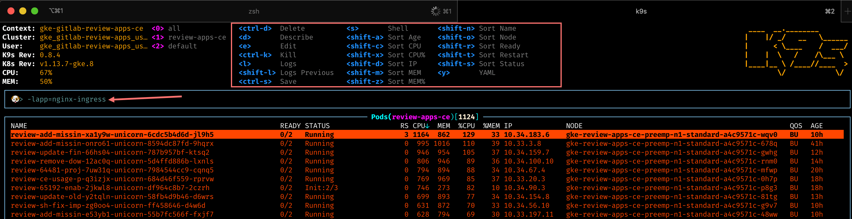 K9s is a powerful command line dashboard which allows you to filter by labels. This can help identify trends with apps exceeding the review-app resource requests. Kubernetes will schedule pods to nodes based on resource requests and allow for CPU usage up to the limits.