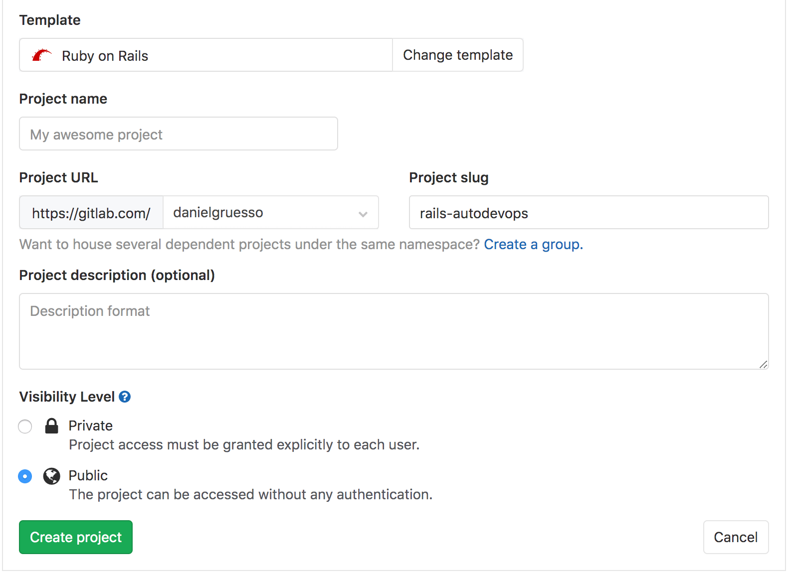 Give your project a name, optionally a description, and make it public so that you can take advantage of the features available in the GitLab Gold plan.