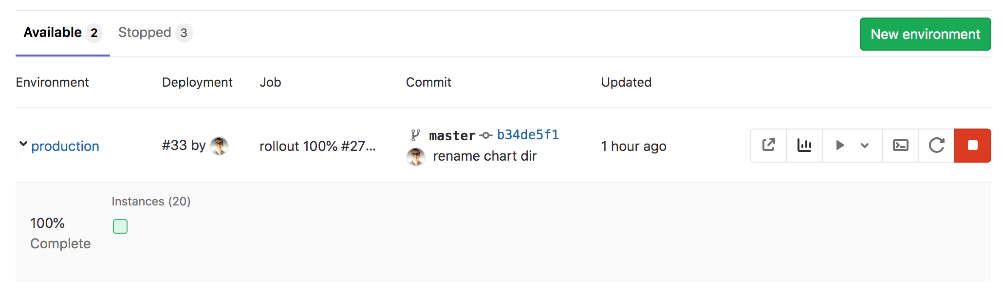 GitLab displays the Deploy Board below the environment's information, with squares representing pods in your Kubernetes cluster, color-coded to show their status. Hovering over a square on the deploy board displays the state of the deployment, and clicking the square takes you to the pod's logs page.