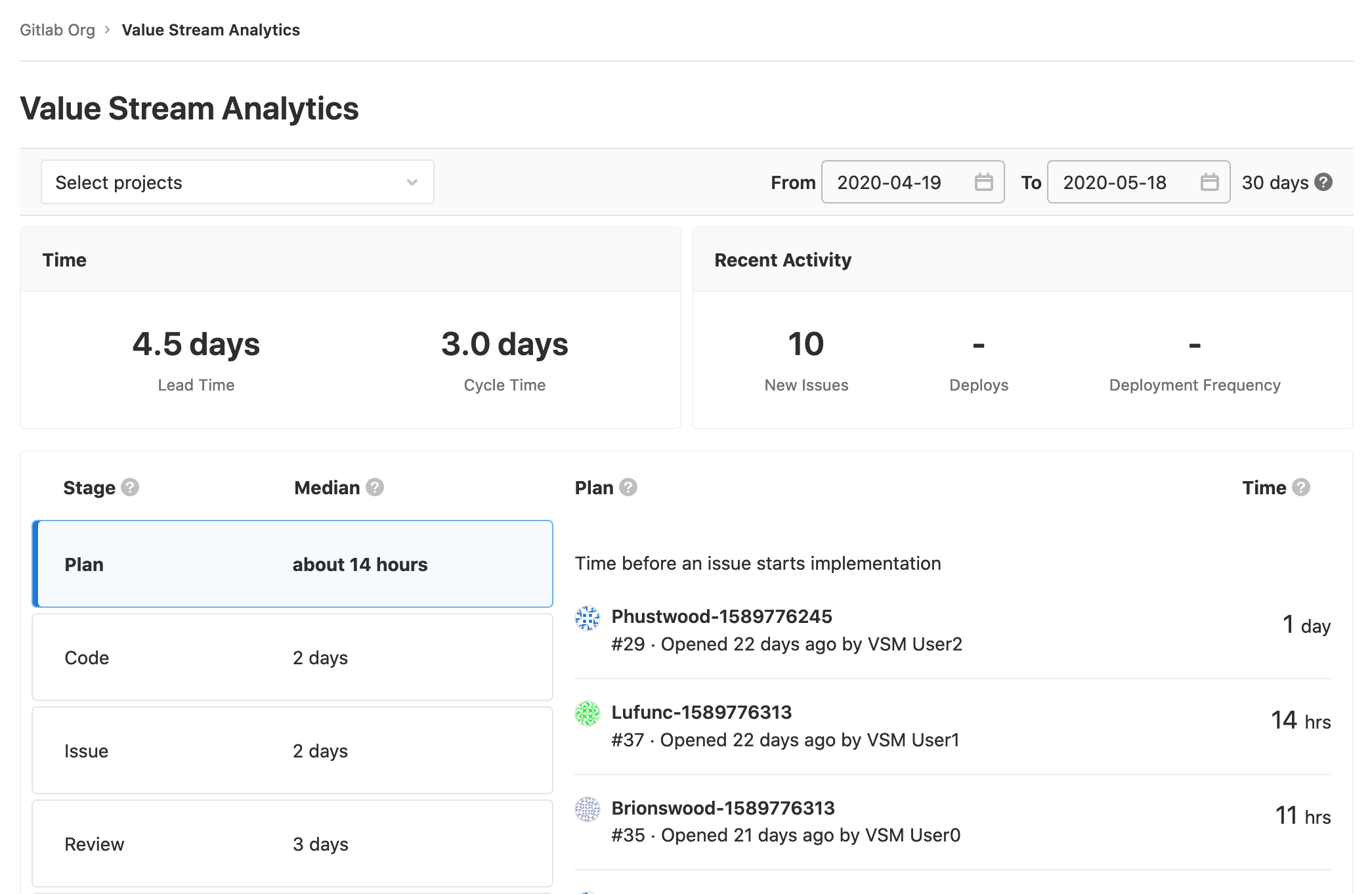 Value Stream Analytics measures the time spent to go from an idea to production (also known as cycle time) for each of your projects. Value Stream Analytics displays the median time spent in each stage defined in the process.