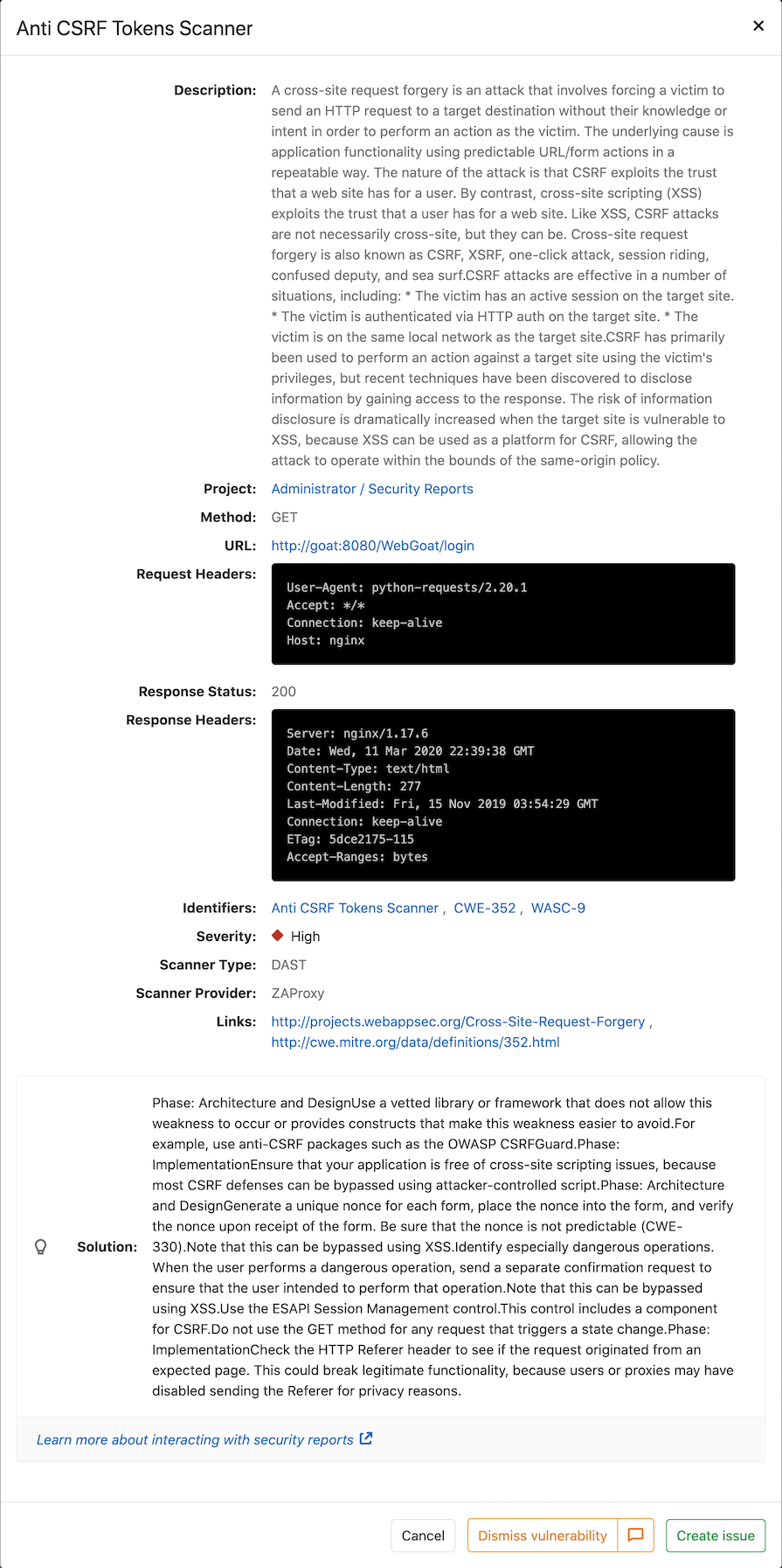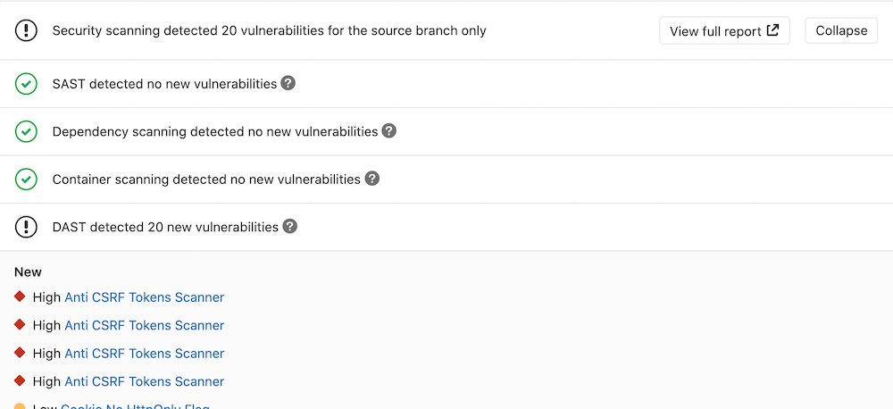 By default, DAST executes ZAP Baseline Scan and performs passive scanning only. It won't actively attack your application. However, DAST can be configured to also perform an active scan: attack your application and produce a more extensive security report. It can be very useful combined with Review Apps.
