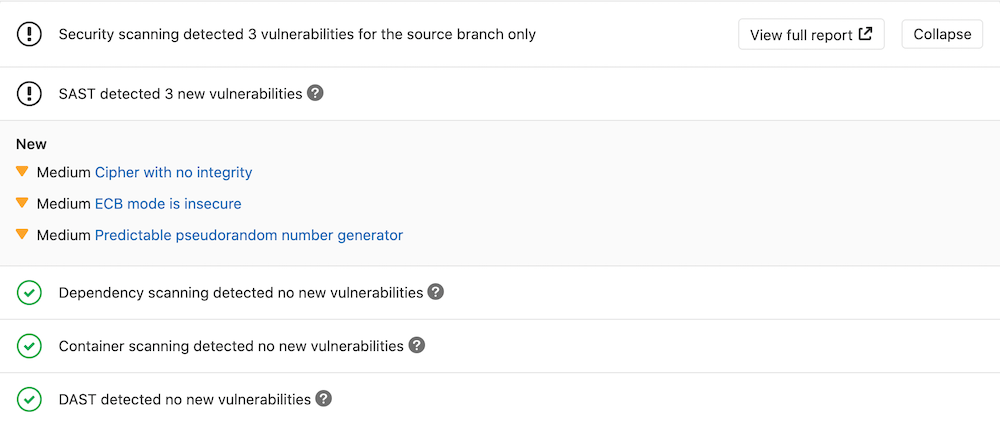 GitLab checks the SAST report, compares the found vulnerabilities between the source and target branches, and shows the information right on the merge request.