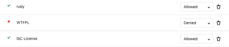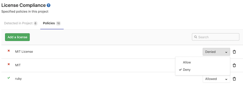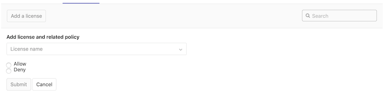 If you are a project or group Maintainer, you can click on a license to be given the choice to allow it or deny it.