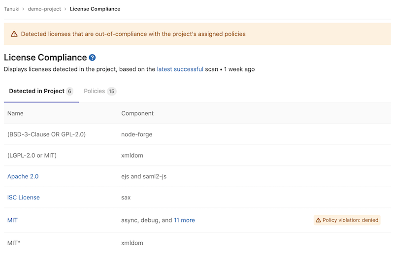When GitLab detects a Denied license, you can view it in the license list.