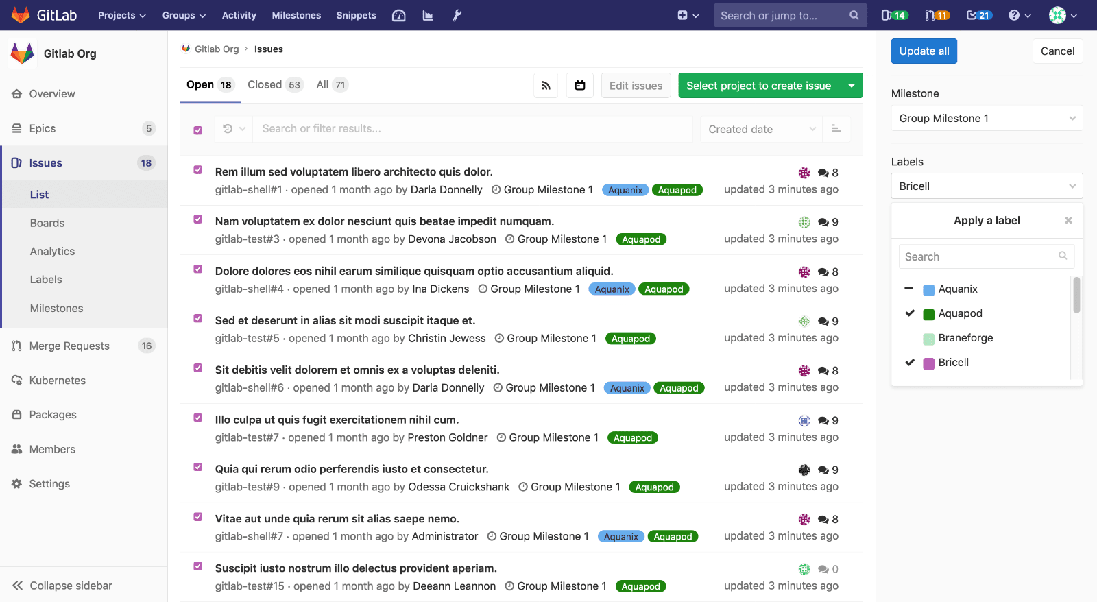 If you want to update attributes across multiple issues, epics, or merge requests in a group, you can do it by bulk editing them, that is, editing them together.