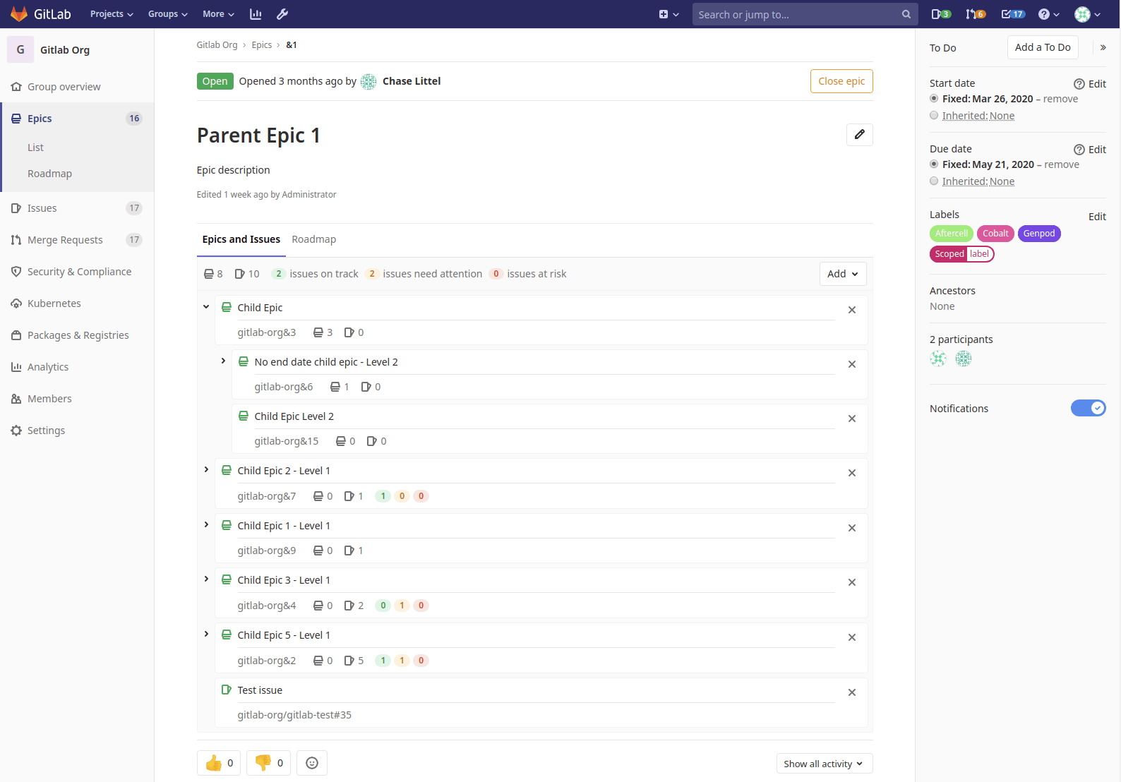 - Roadmap: a roadmap view of child epics which have start and due dates.