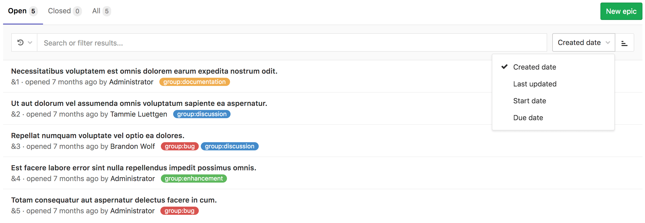 To search, go to the list of epics and click the field Search or filter results. It will display a dropdown menu, from which you can add an author. You can also enter plain text to search by epic title or description. When done, press Enter on your keyboard to filter the list.
