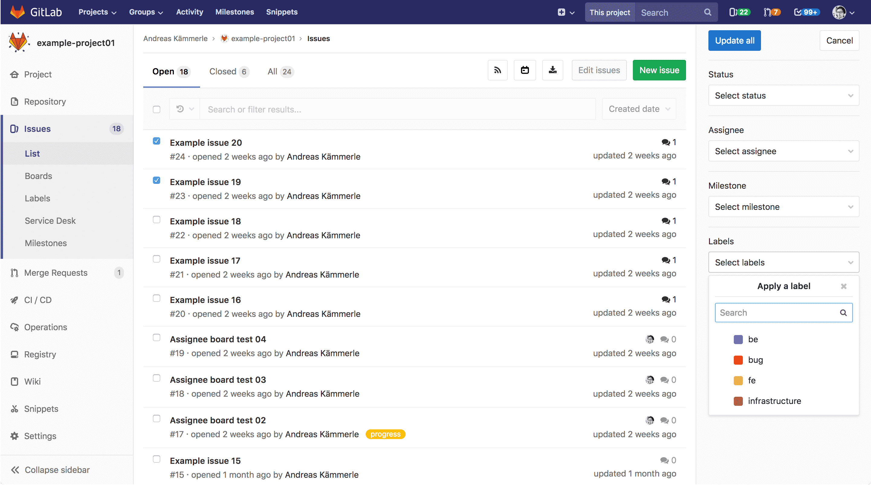 NOTE: Note: Bulk editing issues, epics, and merge requests is also available at the group level. For more details, see Bulk editing issues, epics, and merge requests at the group level.