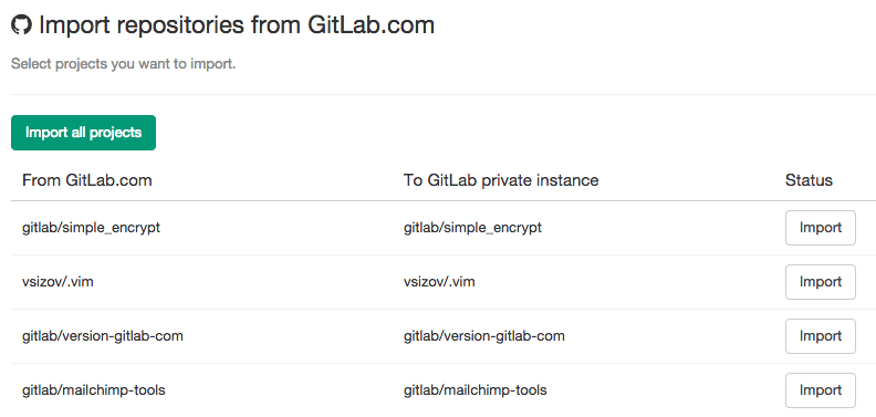 To import a project, click "Import". The importer will import your repository and issues. Once the importer is done, a new GitLab project will be created with your imported data.