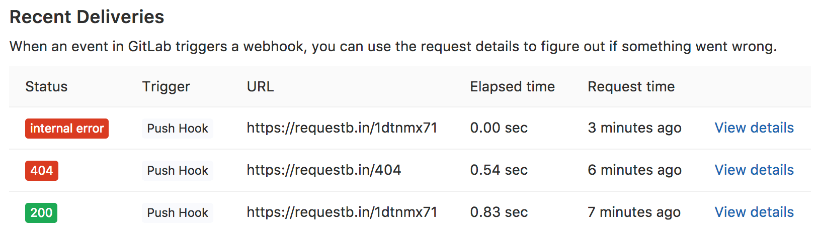 To view more information about the request's execution, click the respective View details link. On the details page, you can see the data sent by GitLab (request headers and body) and the data received by GitLab (response headers and body).
