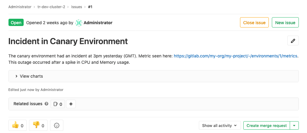 It is also possible to embed either the default dashboard metrics or individual metrics in issue templates. For charts to render side-by-side, links to the entire metrics dashboard or individual metrics should be separated by either a comma or a space.