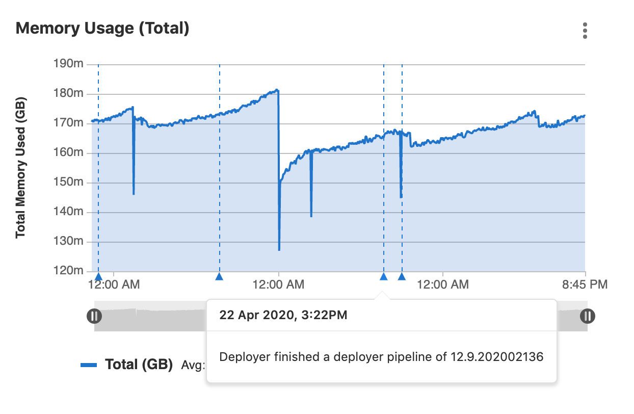 When a source branch has been deployed to an environment, a sparkline and numeric comparison of the average memory consumption will appear. On the sparkline, a dot indicates when the current changes were deployed, with up to 30 minutes of performance data displayed before and after. The comparison shows the difference between the 30 minute average before and after the deployment. This information is updated after each commit has been deployed.