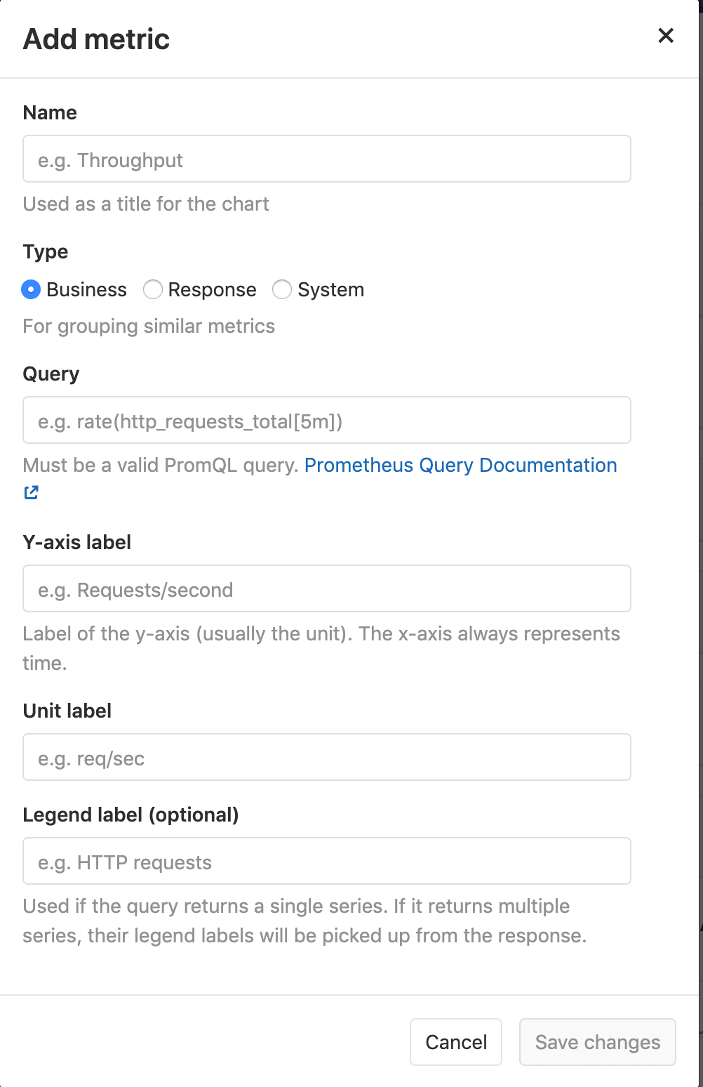 $CI_ENVIRONMENT_SLUGwith the name of your environment. - You may need to re-add the GitLab predefined common metrics. This can be done by running the import common metrics Rake task.