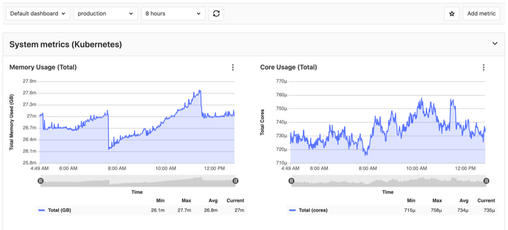 Once enabled, GitLab will automatically detect metrics from known services in the metric library. You can also add your own metrics.