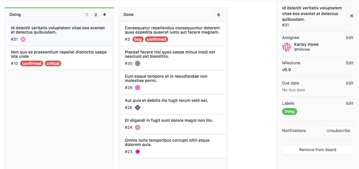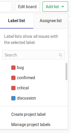- Clicking a label inside a card quickly filters the entire issue board and show only the issues from all lists that have that label.