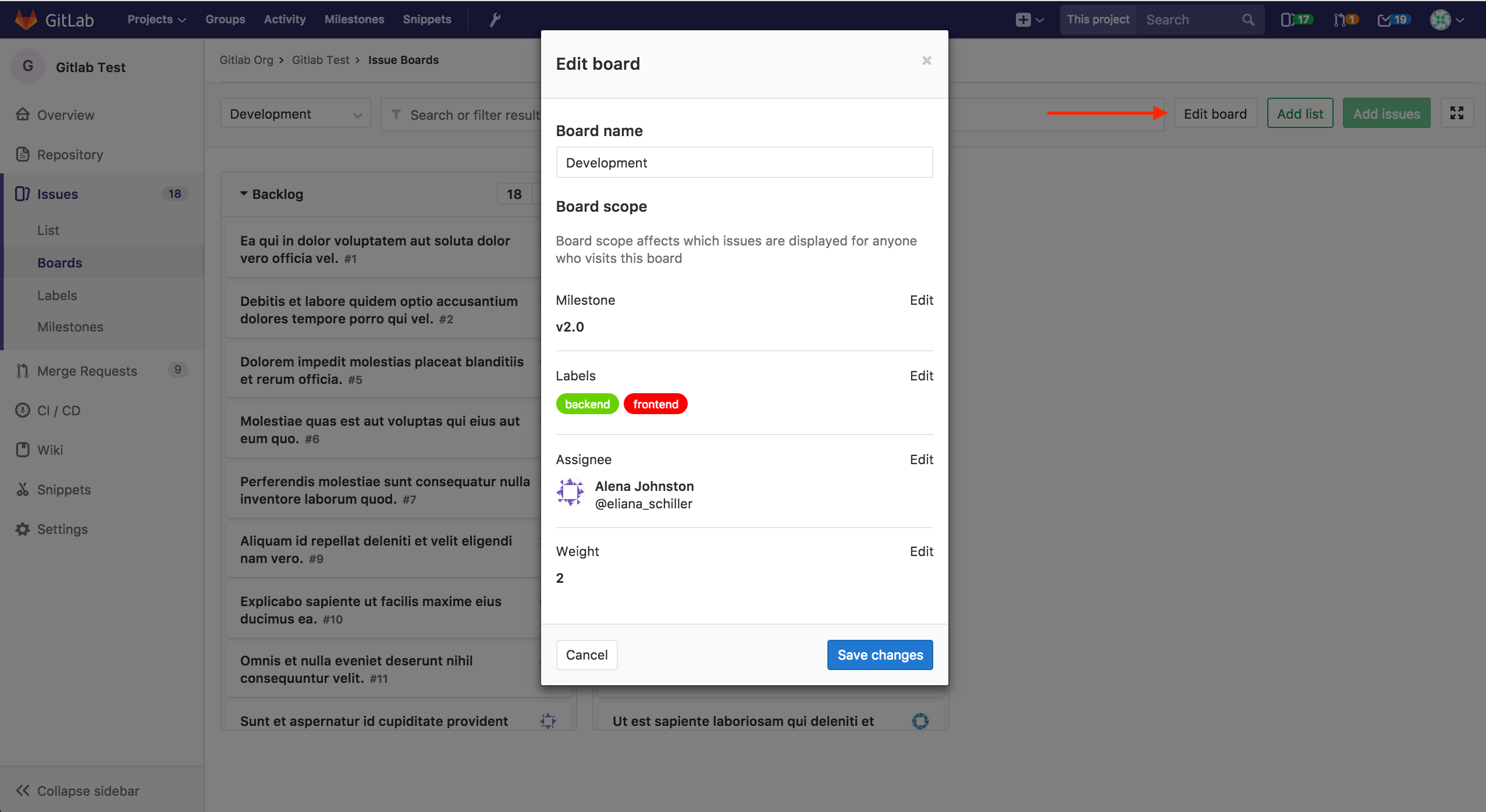 You can define the scope of your board when creating it or by clicking the "Edit board" button. Once a milestone, assignee or weight is assigned to an issue board, you will no longer be able to filter through these in the search bar. In order to do that, you need to remove the desired scope (for example, milestone, assignee, or weight) from the issue board.