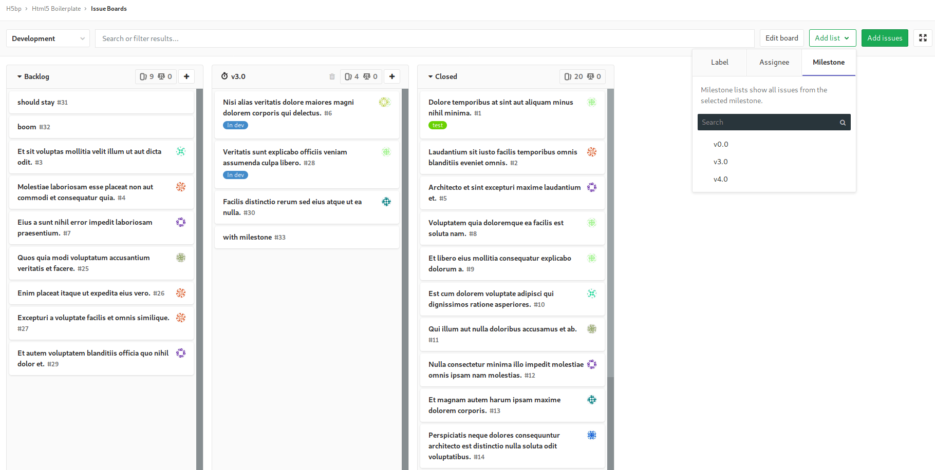 An issue board can be associated with a GitLab Milestone, Labels, Assignee and Weight which will automatically filter the Board issues according to these fields. This allows you to create unique boards according to your team's need.