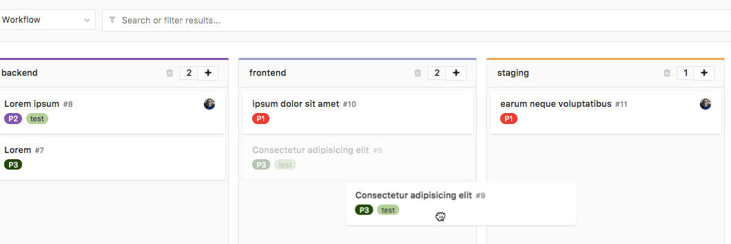 By reordering your lists, you can create workflows. As lists in issue boards are based on labels, it works out of the box with your existing issues. So if you've already labeled things with 'Backend' and 'Frontend', the issue appears in the lists as you create them. In addition, this means you can easily move something between lists by changing a label.