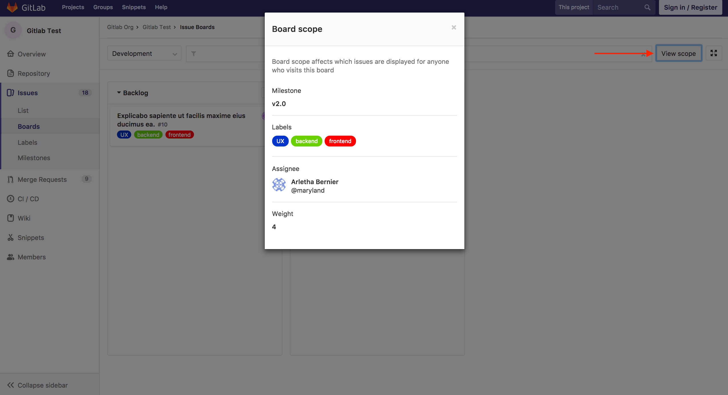 - Enter the new board's name and select its scope: milestone, labels, assignee, or weight.