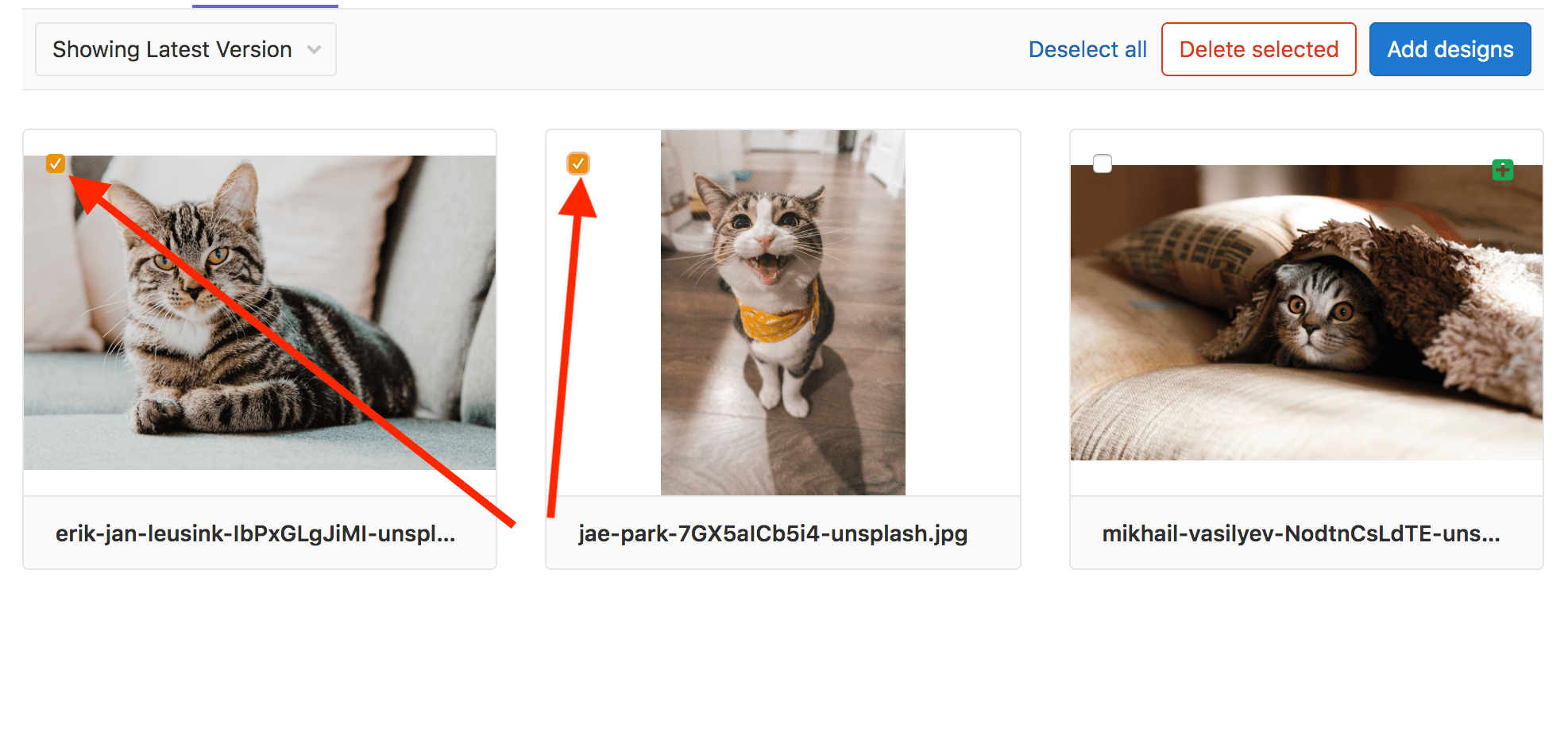 To delete multiple designs at once, on the design's list view, first select the designs you want to delete: