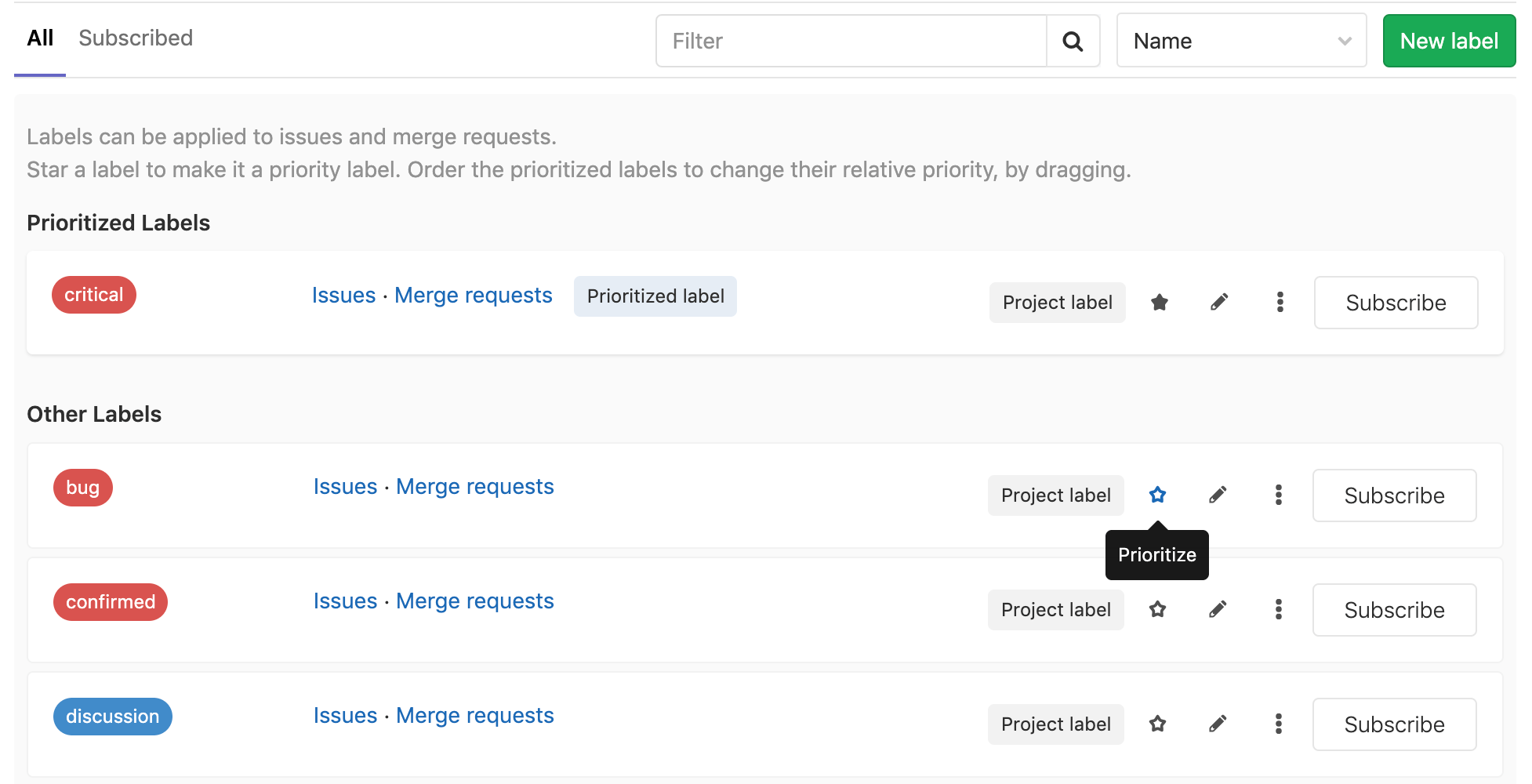 Labels can have relative priorities, which are used in the Label priority and Priority sort orders of the epic, issue, and merge request list pages. Prioritization for both group and project labels happens at the project level, and cannot be done from the group label list.