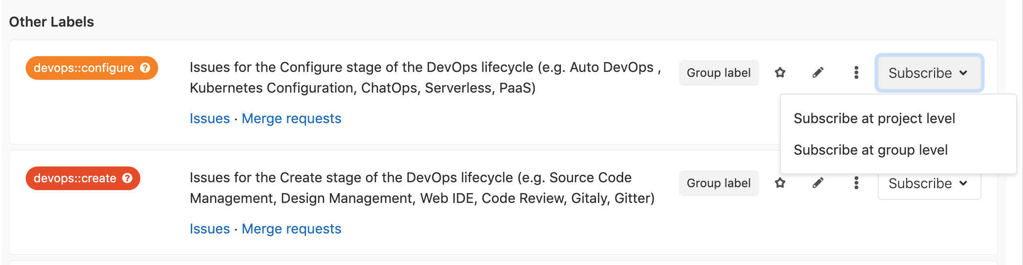 If you are subscribing to a group label from within a project, you can select to subscribe to label notifications for the project only, or the whole group.