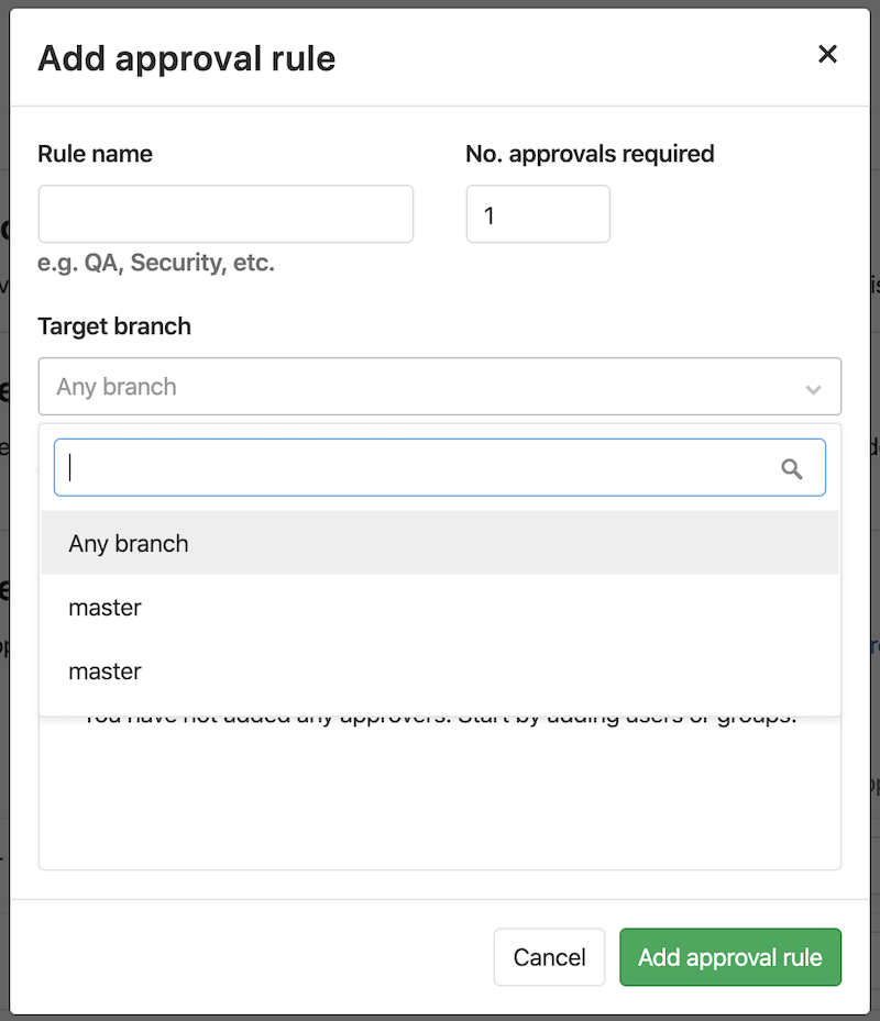 0. - (Optional) Search for users or groups that will be eligible to approve merge requests and click the Add button to add them as approvers. Before typing in the search field, approvers will be suggested based on the previous authors of the files being changed by the merge request.